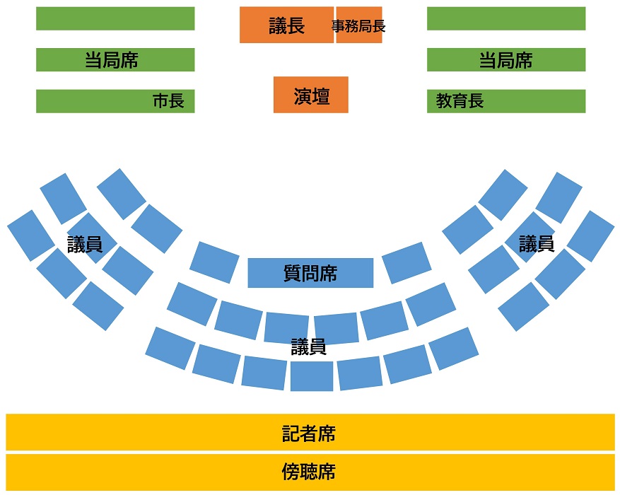 - 「演壇」:市長などの当局の職員が説明したり、議員からの質問に答えたりします。また、議員もここで質問したりします。