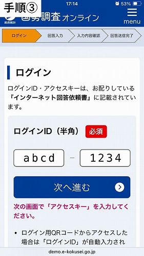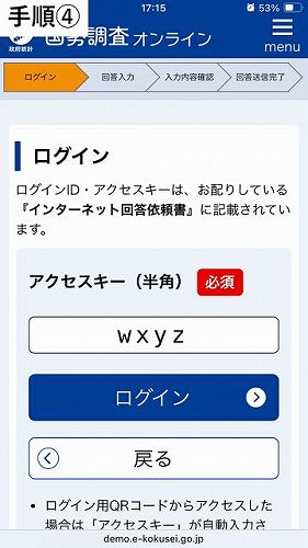 手順【1】に記載されたログインID、続いてアクセスキーを直接入力してログイン完了。回答を開始!