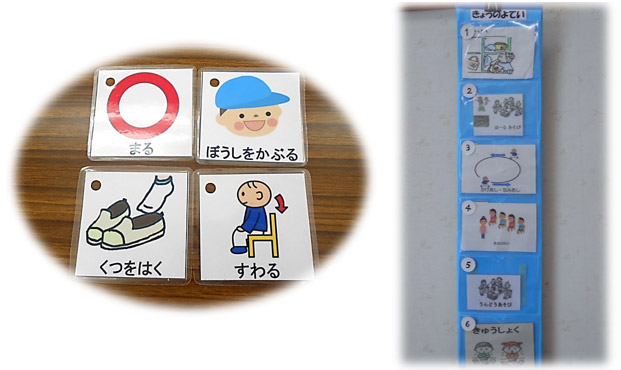 お子さんにわかりやすく視覚支援カード、スケジュール表を使用しています