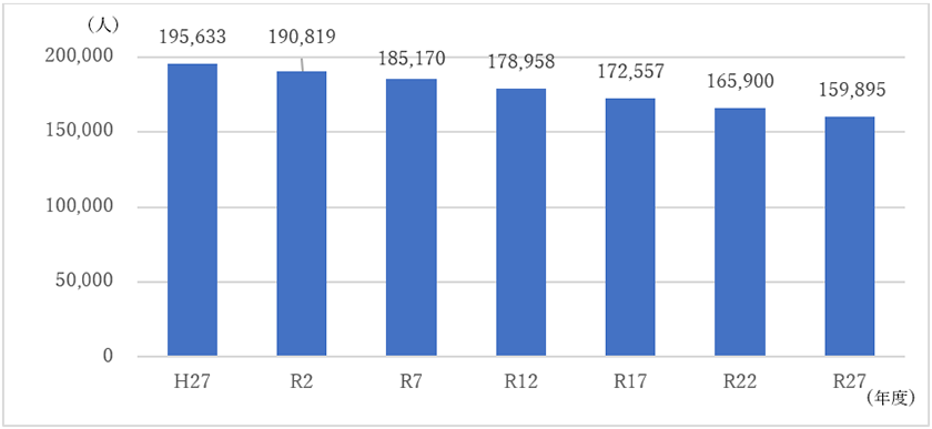 さらに、グラフ3を見ると、本市の人口は、令和2年から令和12年までの10年間で約1万2千人減少し、その後も減少傾向は続く見込みとなることから、水洗化人口も減少することが想定されます。
