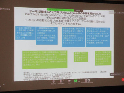 このたび、令和3年度に実施された20件の「まちづくり活動」の成果を検証する活動報告会を開催しました。会場(プラサヴェルデ)とZoomのオンラインに分かれ、代表3団体による活動発表とグループワークを行いました。