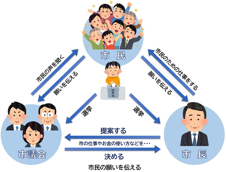 市議会の役割は、市民の代表として、市民の願いや意見を、沼津市の仕事「市政(しせい)」に反映(はんえい)させていくことです。